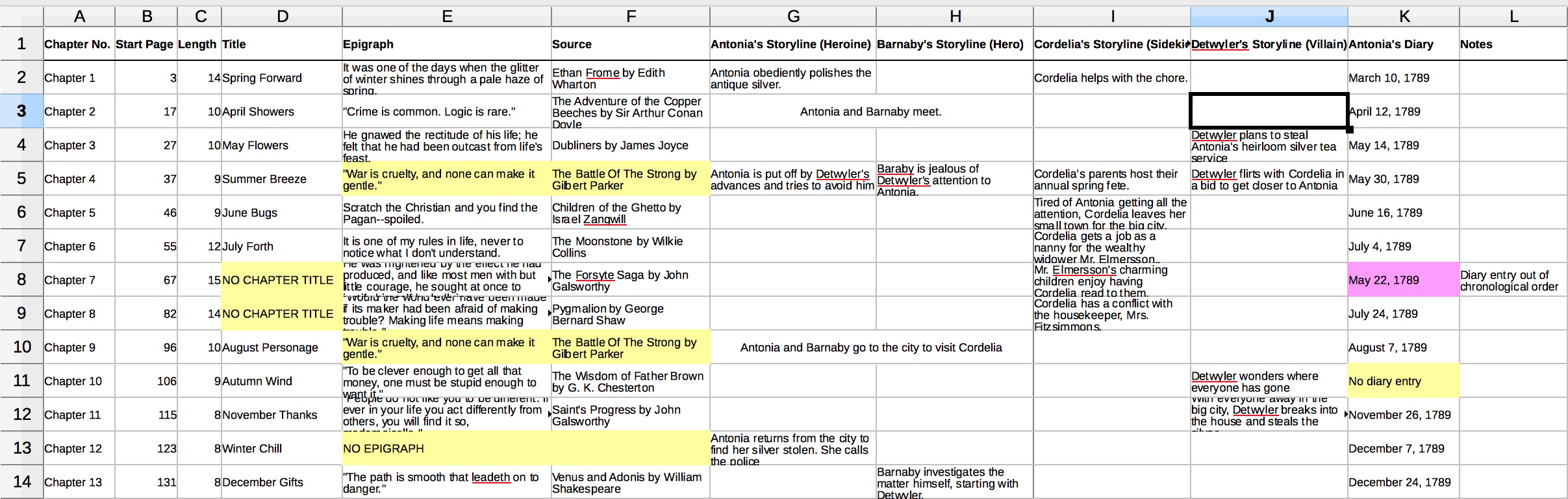 In one novel I edited, most chapters concluded with a diary entry. But some of the chapters lacked this feature. For consistency, every chapter needed a diary entry. The book map clearly showed the author which chapters broke the pattern, and also showed when the entries were out of order.